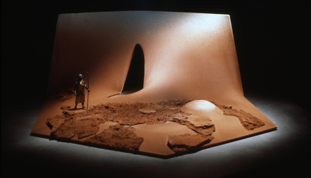 A sheet of rusty metal became a wall in Simon Boccanegra, a polished dish and sphere became the entrance to Caliban’s Cave in The Tempest and the root of a tree became the setting for Howard Brenton’s play The Romans in Britain.